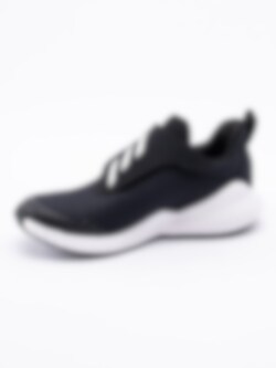 Svarta sportskor Fortarun från Adidas tillverkade i meshtyg med ränder. En justerbar rem med kardborre som öppning. Hälla på bakskaft som hjälpmedel vid påtagning. Vita 3 stripes på kardborrebandet. Förstärkt tå. Logga på utsida av bakparti. Svart foder och löstagbar innersula i textil med logga. Vit mellansula med svart yttersula i syntet med randigt mönster. Yttersulan lämnar inga märken efter sig.