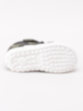 Mörkgröna kamouflagemönstrade första-gå sandalskor från Gulliver i syntet. Svarta sicksack-sömmar som detalj. Skydda de små fötterna i ett par coola camo sandaler med täckt tå och häl. Kardborreknäppning med ett band för enkel på- och avtagning. Textilfodrade med en ljus innersula i syntet med sömlös svart logotyp. Vit yttersula i syntet med prickigt mönster.