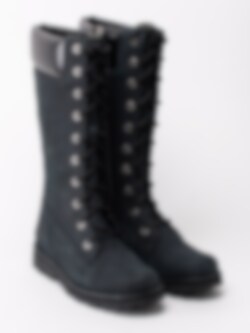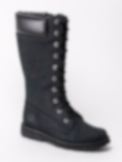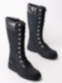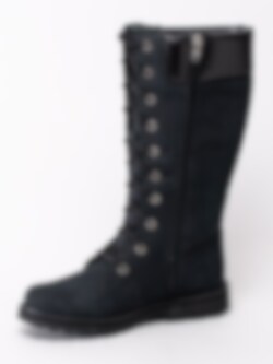 Svarta höga stövlar Courma Kid Girls Tall från Timberland. Jättefin Bikerinspirerad hög stövel i nubuck och lång snörning med snörhål i silver och där skosnörena är från 100% PET. Vadderad kant upptill på skaftet och plös i mjuk textil som är skönt mot benet. Dragkedja på insidan av skaftet för att snabbt och lätt komma i och ur stöveln. Skön uttagbar innersula i andningsbar OrthoLite®. Räfflad gummisula som ger bra grepp mot underlaget. Perfekt stövel till skolan för unga barn som vill se fina ut.