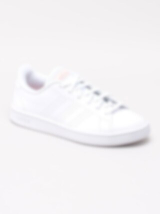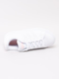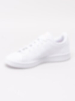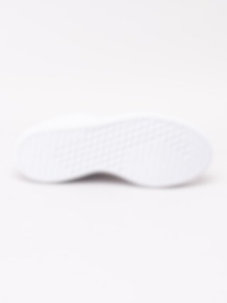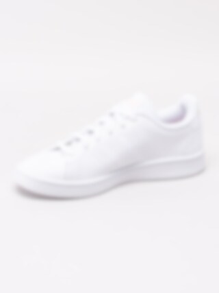Vita sneakers Advantage Base från Adidas tillverkade i syntet och perforering som detalj. Vit platt 6-håls snörning i polyester som öppning. Vitt foder och rosa innersula i textil. Sömlös logga på bakparti och framparti. Vit sula med konturerad logga på utsidan. Vit yttersula i syntet med konturerat hexagonmönster.