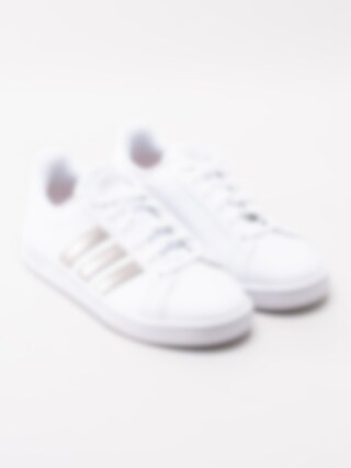 Vita sneakers Grand Court från Adidas tillverkade i syntet med sydda, bronsfärgade 3-stripes på utsidan och perforering på insidan som detalj. Broderad logga på plös. Vit platt 6-håls snörning i polyester som öppning. Vitt foder och innersula i textil med sömlös logga. Sömlös logga på bakparti. Vit sula med konturerad logga på utsidan. Vit yttersula i syntet med konturerat hexagonmönster.