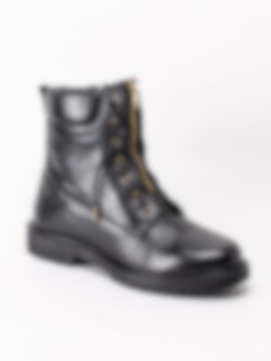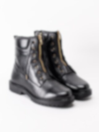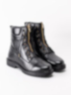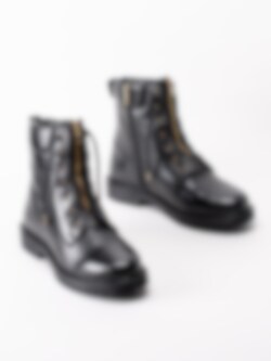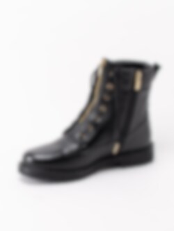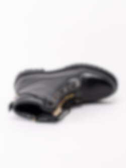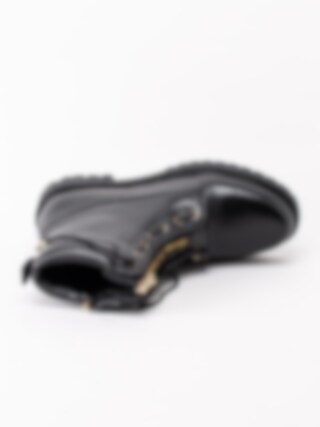 Svarta snörkängor Vilma från Copenhagen Shoes i skinn. Bikerinspirerad känga i skinn med fina detaljer i guld. Snörparti med guldöljetter och dragkedja som dekoration och justering av passform. Dragkedja för att snabbt komma i och ur finns på insidan. Vadderad kant och dragflik på skaftet. Innersula i skinn som är mjuk och skön och den är lätt varmfodrad med textil. Snygg siluett på yttersulan som också har en bra räffling undertill för ett bra grepp mot underlaget. Snygg känga med extra detaljer till en härlig höst.