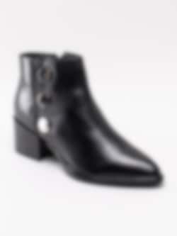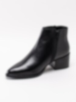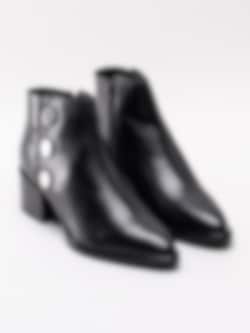 Svarta ankelboots Wham från Copenhagen Shoes tillverkade i skinn med medelhögt skaft. Stilrena boots med tre silverknappar på utsidan som detalj. Dragkedja på insidan som öppning. Textilfodrade med en behaglig skinnsula. Klossklack med utstickande kanter på ca 5.5 cm.