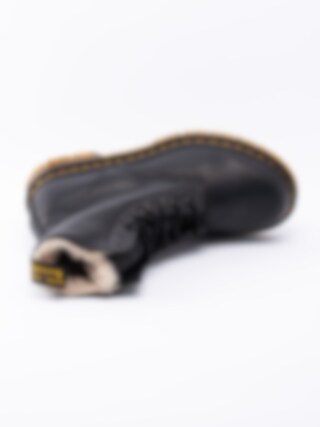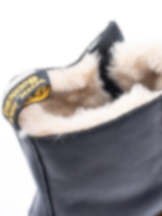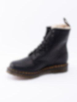 Svarta fodrade kängor Serena från Dr Martens i skinn. Svart snörning i polyester på 8 hål som öppning. Hälla på bakskaft som hjälpmedel vid påtagning. Ljust foder och innersula i fuskpäls. Gul söm längs sulkant. Mörk yttersula i syntet med grovt mönster.