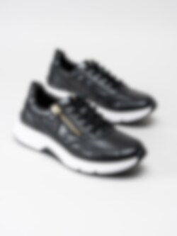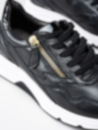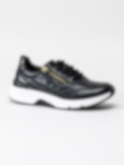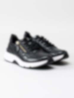 Svarta sneakers i skinn från Gabor. Sköna promenadskor med snörning och dragkedja på sidan för skön passform.