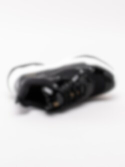 Svarta sneakers Posh från Happy Shoes tillverkade i syntetlack med partier i meshtyg. Sömlös logga på utsidan av hälen och på plös. Svart rund 5-håls snörning i polyester med hällor som öppning. Hälla i nylon på bakskaft samt plös som hjälpmedel vid påtagning. Svart foder och löstagbar innersula i textil. Vit sula med svarta partier som detalj. Klack på ca 5 cm med platå på ca 3.5 cm. Vit yttersula i syntet med mönster.