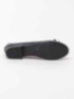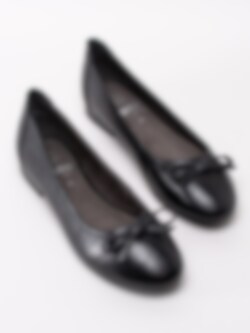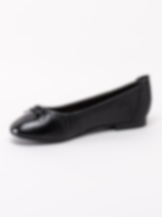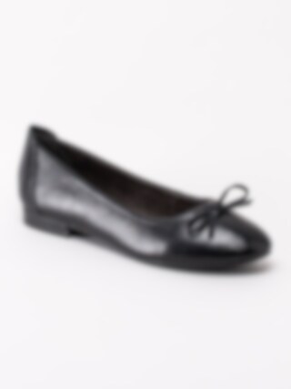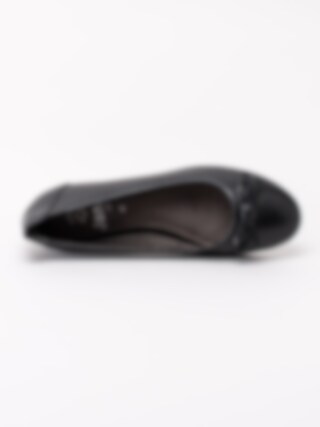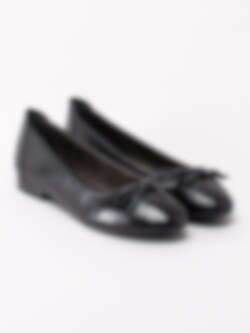 Svarta ballerina i skinn från Jana. Svart foder och innersula i textil. Denna klassiska ballerina har en lite bredare läst som passar dig som har en lite bredare fot. Det är därför det står H i innersulan. Dekorativ rosett framtill. Svart yttersula i syntet med mönster.