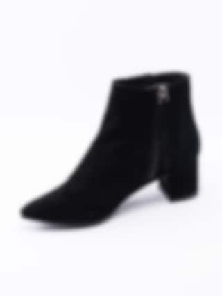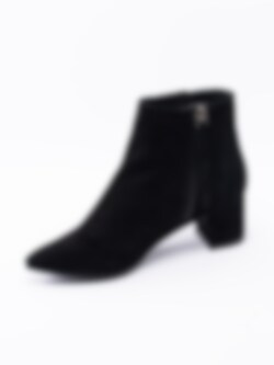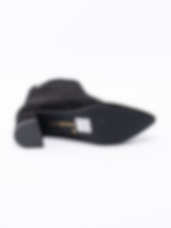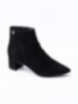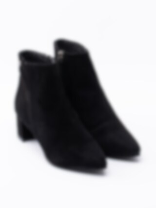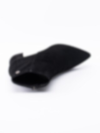 Stövlett Bree från Copenhagen Shoes är en svart mockaboot. Dekorativ nit på utsidan av skaftkant. Dragkedja på insidan som öppning. Svart foder i textil och innersula i skinn. Klädd klossklack i mocka på ca 5 cm höjd. Svart yttersula i syntet med slät yta och logga.