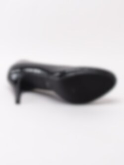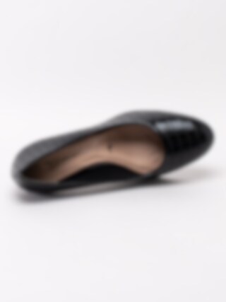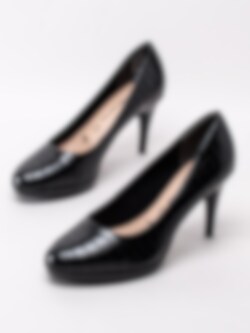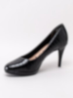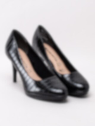 Svarta högklackade pumps från Tamaris i ormmönster. Skorna har en böjd skärning vid öppning för att ge den klassiska designen en subtil och snygg detalj. Rund skärning med spetsig tå. Textilfodrade med skön Touch It innersula i syntet för extra komfort. Klädd klack i snake print på ca 9 cm. Svart yttersula i syntet med slät yta.