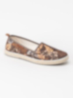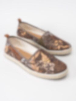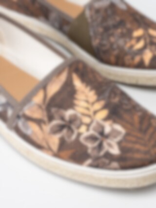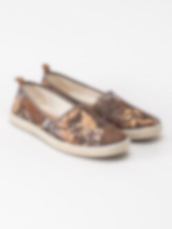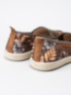 Bruna blommönstrade slip on loafers Corvette från Marstrand tillverkade i textil med kant i brun syntet. Snygga slip on tygskor som är enkla och lätta att ta på. Textilfodrade med mjuk skinnsula. Repbeklädd mellansula som är klassiskt för en espadrillos-modell. Ljus yttersula i syntet.