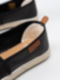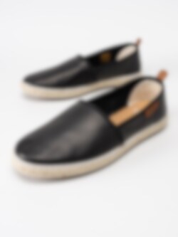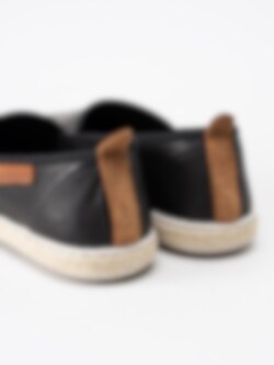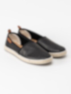 Svarta slip on loafers Plaza från Marstrand tillverkade i textil med kant i svart syntet. Snygga slip on tygskor som är enkla och lätta att ta på. Textilfodrade med mjuk skinnsula. Repbeklädd mellansula som är klassiskt för en espadrillos-modell. Ljus yttersula i syntet.
