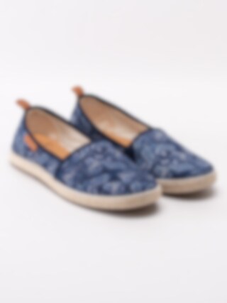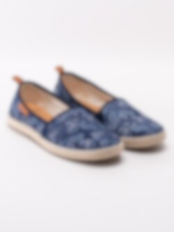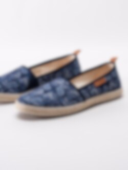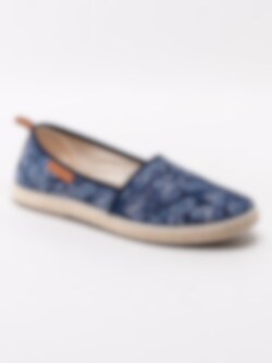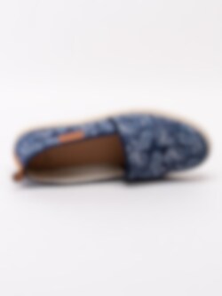 Mörkblå espadriller Corvette från Marstrand i textil. Sköna espadriller med paisley-mönster. Typiska sommarskor som du smidigt och enkelt trär på foten och kan matchas till många sommaroutfits. Läderbit med präglad logotyp på utsidan. Foder i textil med skinnklädd, löstagbar innersula som känns skönt mot foten. Repklädd mellansula med beige yttersula i syntet.