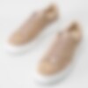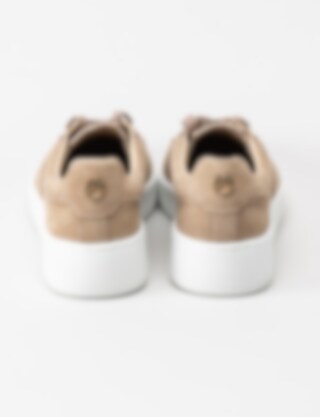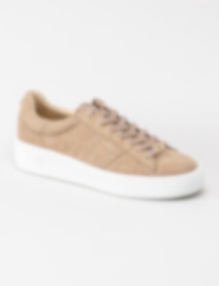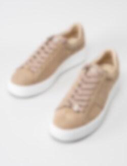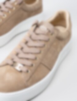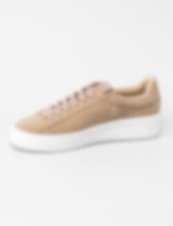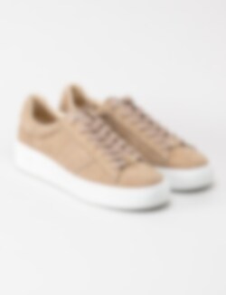 Beige sneakers Serena Caramel från Philip Hog i mocka. En vårfavorit i beige med dekorativ guldlogga i snörning samt öljetter i guld. Cool platåsula fulländar denna modell och förhöjer vilken vardagsoufit som helst denna säsong.