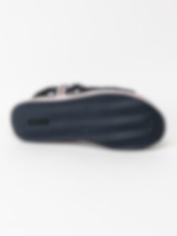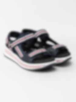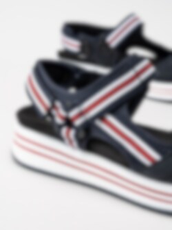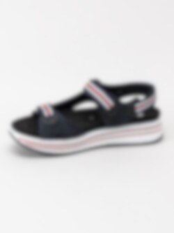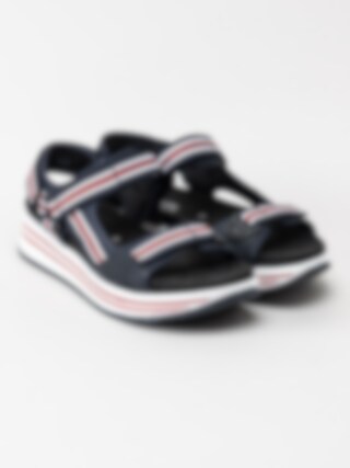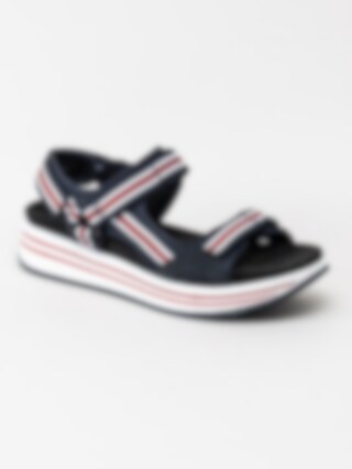 Blå sandaler från Remonte i textil med vita och röda detaljer.