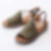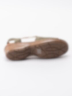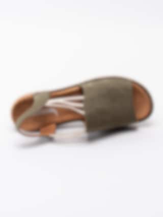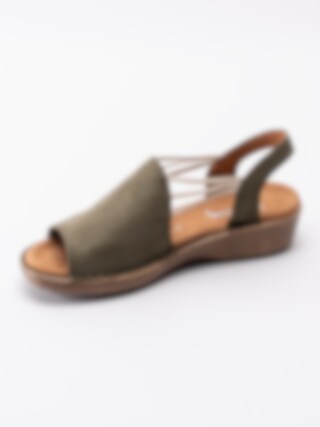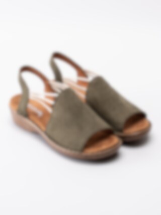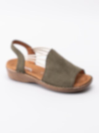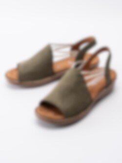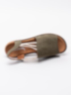 Mörkgröna sandaler från Jenny by Ara tillverkade i mockaimitation. Brett band över fot med öppen tå. Tre resårremmar på in- och utsidan som sitter ihop med en hälrem för lätt på- och avtagning samt för att hålla sandal på fot. Brunt foder och innersula i textil med sömlös logga i häl. Låg kilkack på ca 4 cm med platå på ca 2 cm. Brun yttersula i syntet med mönster.