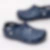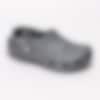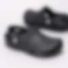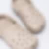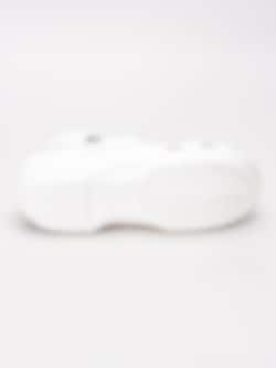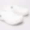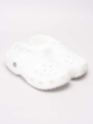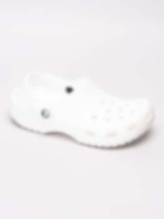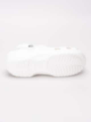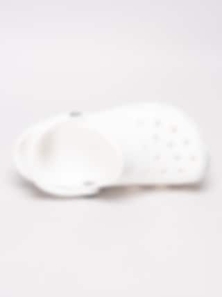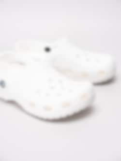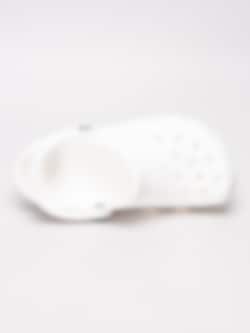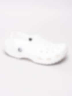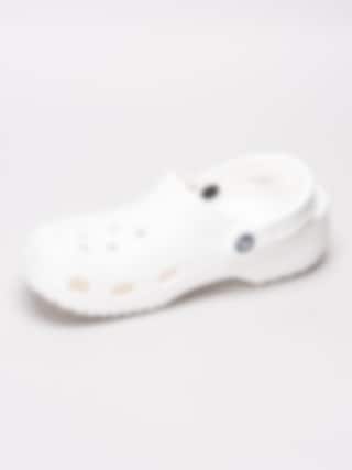 Vita tofflor Classic Clog från Crocs tillverkade i mjukt Croslite material för ökad komfort och stötdämpning. Lufthål på ovandel och vid främre partiet. Rem som går att fälla upp och ned. Rund svart plastbit med vit logga som håller remmen på plats. Yttersula i syntet med randigt mönster.