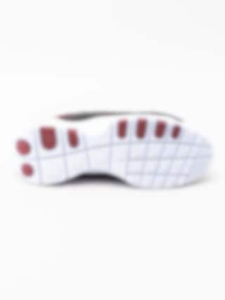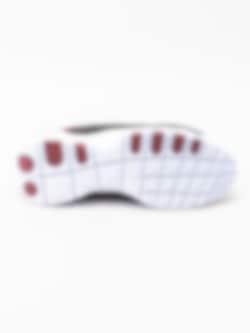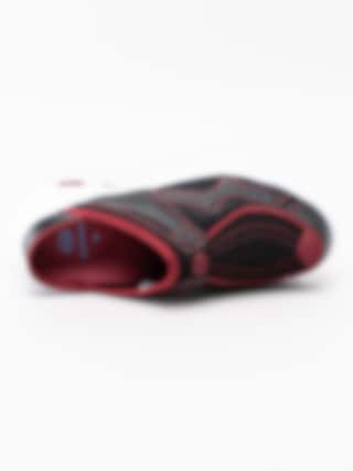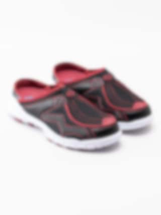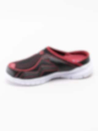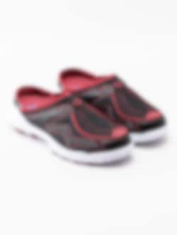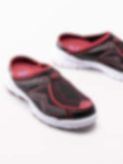 Svarta slip ins tofflor Jump från Scholl tillverkade i meshtyg och partier i syntet. Röda sömmar och partier som detalj. Konturerad logga på ovandel. Utrustad med Biomechanics-fotbädd som avlastar leder och lindrar smärta i hälar, vrister och knän. Slip in modell med låg bakkappa för att hålla foten på plats. Foder och löstagbar innersula i textil med uppbyggd hålfot och sömlös blå logga i hälen. Låg klack på ca 4 cm med platå på ca 2 cm. Vit yttersula i syntet med randigt mönster.