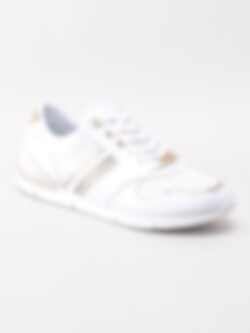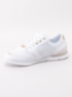 Vita sportiga sneakers Lightweight Metallic Trainers från Tommy Hilfiger i veganskt läder och stickad mesh. Lätta sportiga sneakers som du kan likaväl ha på gymmet som till vardags. Snygga gulddetaljer som ger skorna en snygg och exklusiv touch. Vit 6-håls snörning i bomull med smyckeslogga längst ned som detalj. Textilfodrade och innersula i textil om är mjuk och känns skön mot foten. Vit sula i gummi med konturerad logotyp på yttersula.