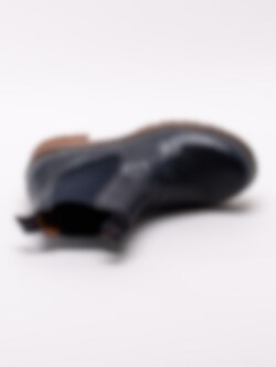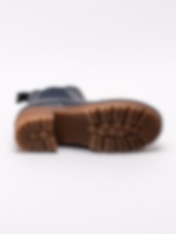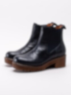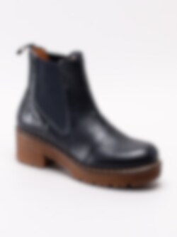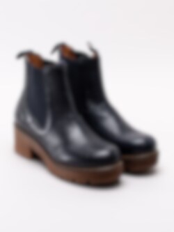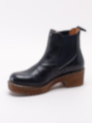 Mörkblå chelsea boots Clarisse Elastic från Ten Points tillverkade i vegetabiliskt skinn. Vegetabilisk garvning är en form av garvning när garvaren använder vegetabiliska garvämnen. Till skillnad mot exempelvis kromgarvning är vegetabilisk garvning relativt skonsamt för miljön. Klassisk modell med en grov platåsula. Resår på in- och utsidan samt hälla i nylon med logga på skaftkant som hjälpmedel vid påtagning. Textilfodrade med löstagbar innersula i filt. Ljus söm längs sulkant. Brun klossklack på ca 5.5 cm.