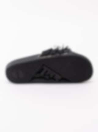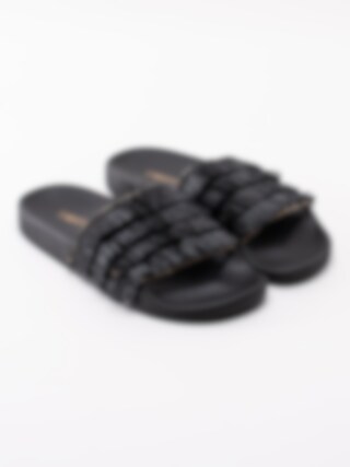 Svarta slip ins badsandaler Rafia från The White Brand tillverkade med 4 lager i bastimitation. Svart foder i textil och konturerad innersula i syntet med sömlös vit logga i hälen. Svart yttersula i syntet med prickigt mönster och konturerad logga.