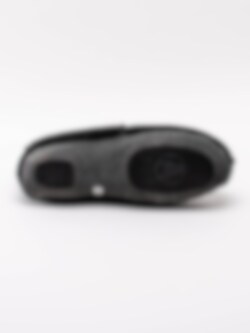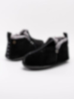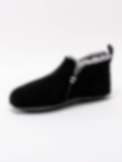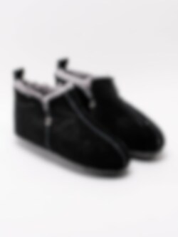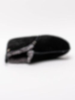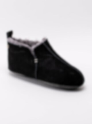 Svarta varma tofflor Innsbruck från Axelda tillverkade i mocka. Varmfodrade slip on tofflor med fårskinnsfoder. Behöver du ett par varma, mysiga tofflor i en slip on modell är dessa de givna valet! Sömmar och sydda kryss längs bakparti som detalj. Smyckeslogga och präglad logga på utsidan av bakparti. Hälla på bakskaft som hjälpmedel vid påtagning. Mjuk sula i mocka med gummerade trampdynor för att ge ett bra fäste.