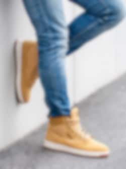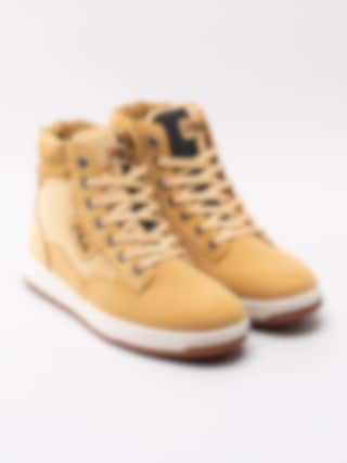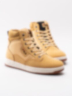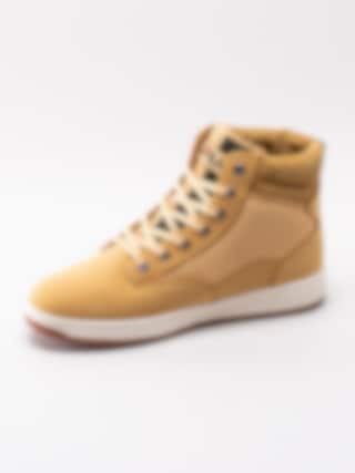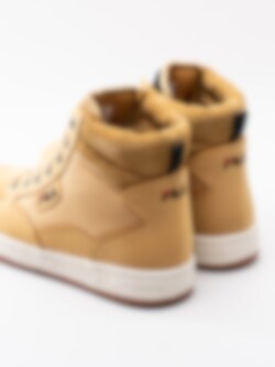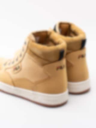 Gula höga sneakers kängor Knox Mid från FILA tillverkade i skinn med syntetisk yta. FILA är tillbaka med en klassisk sneaker-kängamodell för män. 7 håls-snörning i nylon som öppning samt för att justera passformen. Broderad logga på plös och på utsidan som detalj. Svartgul-delad plös för att ge kängorna karaktär.