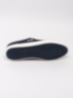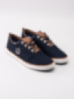 Mörkblå snörskor från Bugatti tillverkad i textil med sömmar i detalj. Smyckeslogga på utsidan. Brun syntetbit med präglad logga på plös. Brun snörning i bomull på 4 hål med öljetter i silver som öppning. Flerfärgad hälla på bakskaft som hjälpmedel vid påtagning. Blått foder och innersula i textil med sömlös logga. Brun rand längs sulkant med vit mellansula. Mörkblå yttersula i syntet med vågigt mönster och logga.