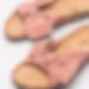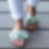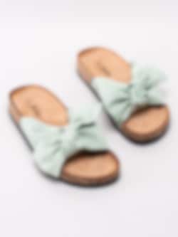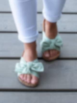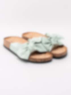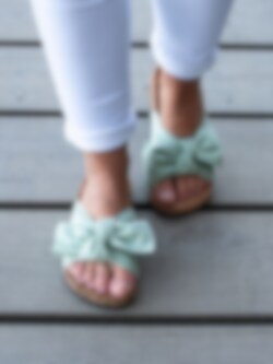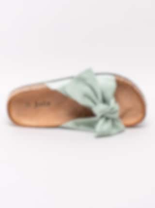 Pastellgröna slip in sandaler från Joia i textil med stor rosett. Lätta sandaler och enkla att ta på. Insida och innersula i textil med sömlös logga i hälen. Mellansula i korkimiation med upphöjd kant. Svart yttersula i syntet mönster och präglad logga i mitten.