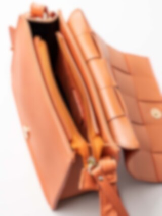 Orange flätad axelremsväska från Ulrika Design. Väskan har en ficka med dragkedja och tre kortfack.