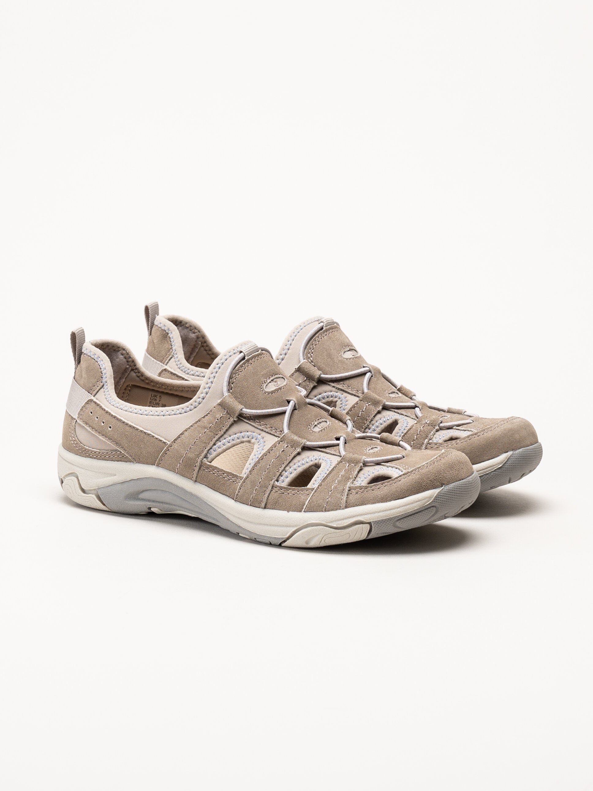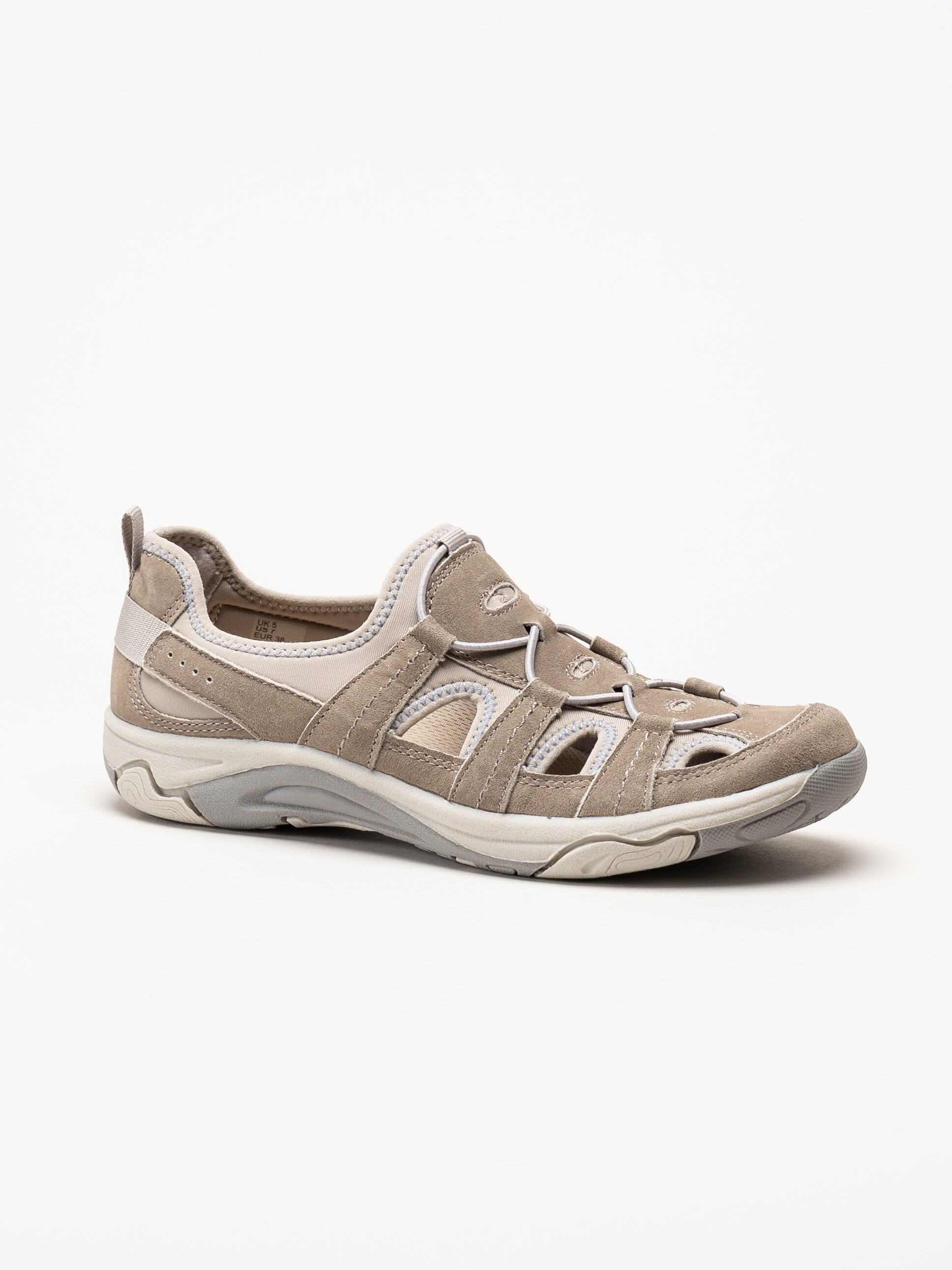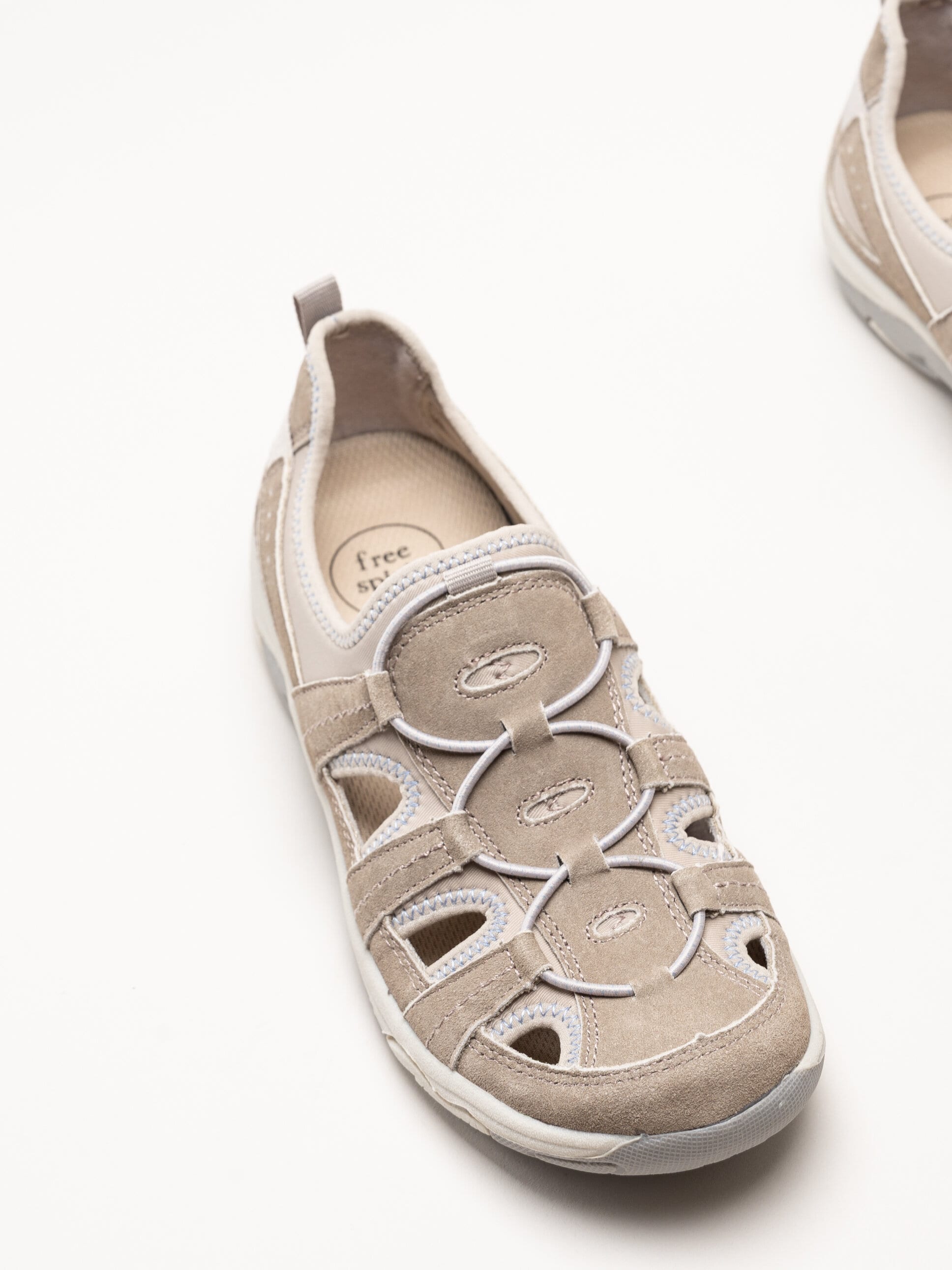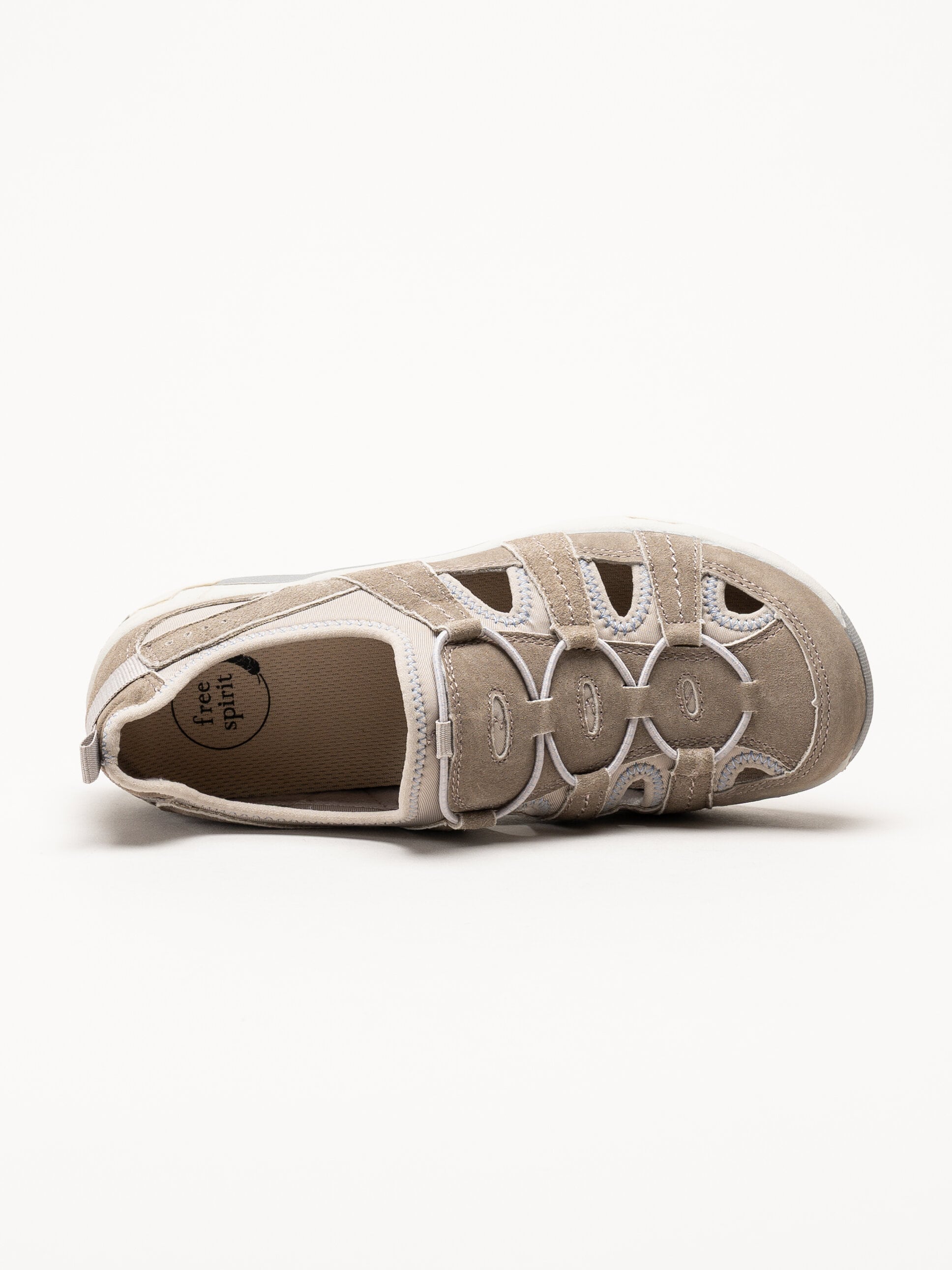 Beige sandaler Perle från Free Spirit by Axelda i färgen Sand. Ovandelen är tillverkad i en kombination av mocka och textil som ger ett mjukt och följsamt uttryck. Modellen har en praktisk och lättburen konstruktion som passar bra för både vardag och lediga tillfällen.