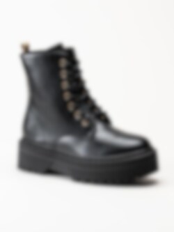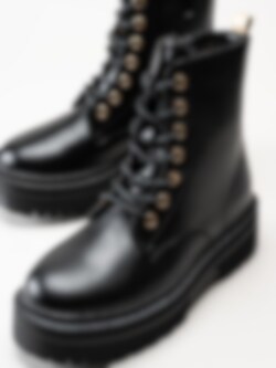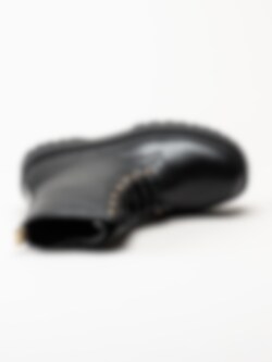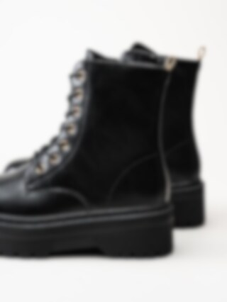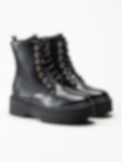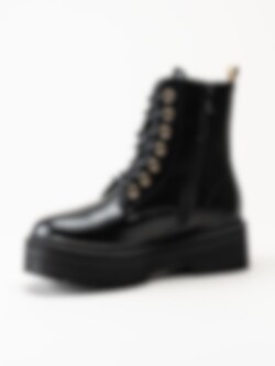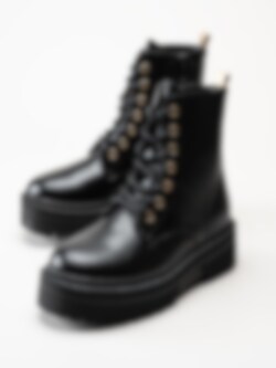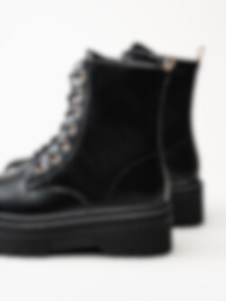Svarta platåkängor från Duffy. Skorna har en kort hårig foder i fuskpäls. Innersula i syntet. Yttersula i syntet med en platåhöjd på ca 4.5 cm och en klackhöjd på ca 5.5 cm.