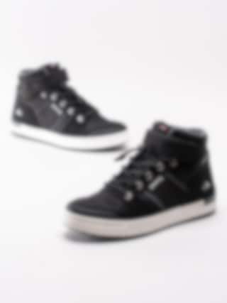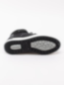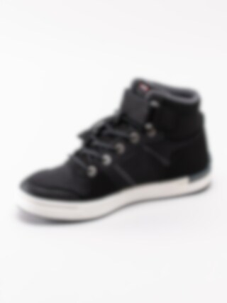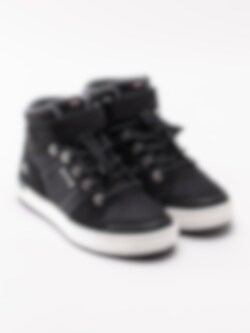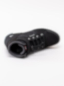 Svarta fritidskängor Tonsen Mid från Viking för juniorer tillverkade i meshtyg med partier i syntet. Utrustad med Gore-Tex membran som gör skon vattentät samtidigt som den andas. Konturerad logga på kardborreband och sydd tygbit på utsidan med logga. Svart justerbart kardborreband som öppning och svartgrå 5-håls snörning i resår med svart snörstopp för att hålla foten på plats. Grått foder och löstagbar innersula i textil. Vit mellansula med svart yttersula i syntet med mönster och grå partier. Konturerad logga i hälen.