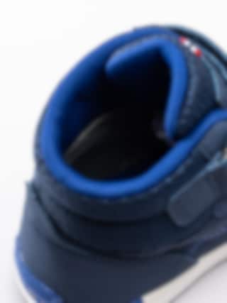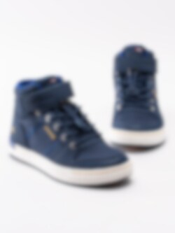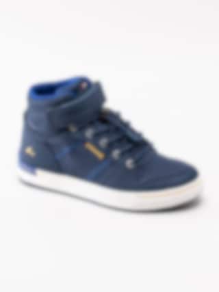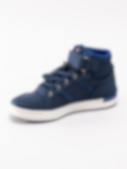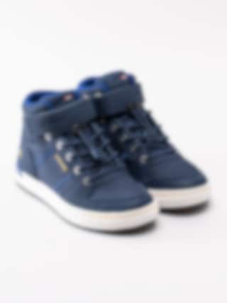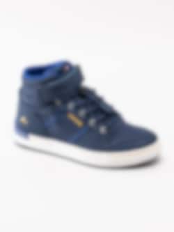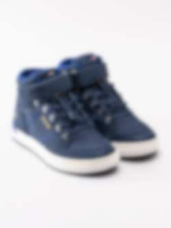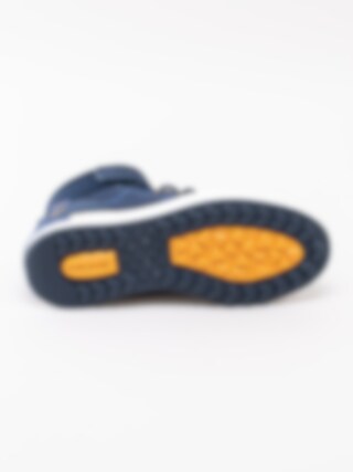 Mörkblå fritidskängor Tonsen Mid från Viking för barn tillverkade i meshtyg med partier i syntet. Utrustad med Gore-Tex membran som gör skon vattentät samtidigt som den andas. Konturerad logga på kardborreband och sydd tygbit på utsidan med logga. Mörkblått justerbart kardborreband som öppning och mörkblå 5-håls snörning i resår med svart snörstopp för att hålla foten på plats. Grått foder och löstagbar innersula i textil. Vit mellansula med svart yttersula i syntet med mönster och grå partier. Konturerad logga i hälen.