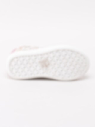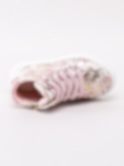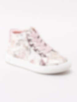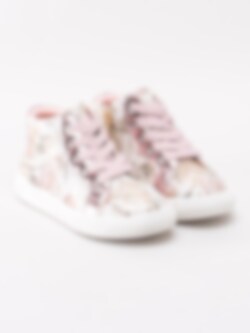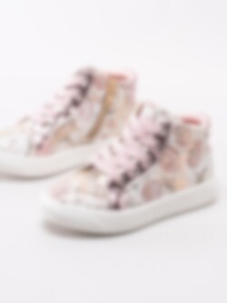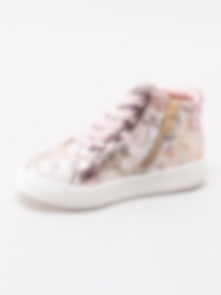 Rosaskimrande höga sneakers med blommotiv från Gulliver i syntet. Ljuvliga höga sneakers-kängor i härliga vårfärger. Rosametalliska partier som detalj. Rosa 5-håls snörning i polyester och dragkedja på insidan som öppning. Textilfodrade med innersula i syntet. Vit sula i syntet med prickigt mönster.