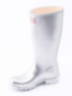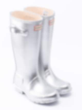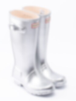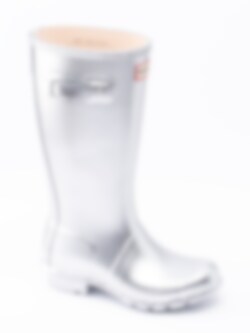 Gummistövel Original Kids från Hunter är en klassisk gummistövel i silver. Tillverkad i naturgummi. Utmärkt om man vill sticka ut i mörkret. Dekorativ rem med spänne i silver på utsidan. Präglad logga på framsidan av skaftet. Reflexer på bakparti. Beigt foder och innersula i textil med logga. Yttersula i gummi med randigt mönster och logga.