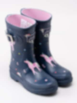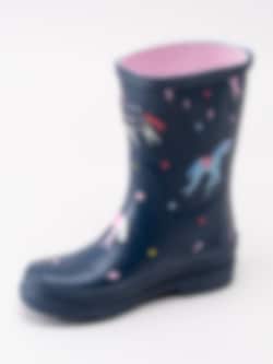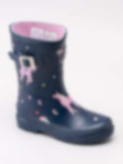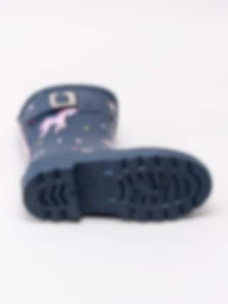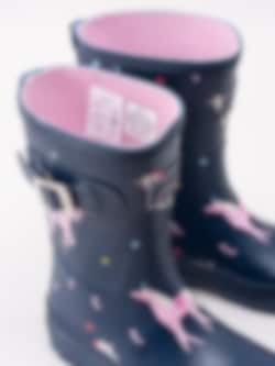 Mörkblå gummistövlar Jnr Welly Print från Joules tillverkade i naturgummi rosa enhörningar. Dekorativ rem med spänne i silver på utsidan. Präglad logga på framsidan av skaftet. Förstärkt kant längs skaftet och sulan. Rosa foder och löstagbar innersula i textil. Mörkblå yttersula i gummi med grovt mönster och logga.