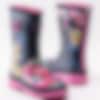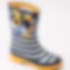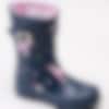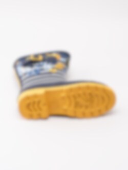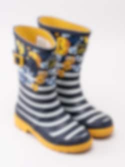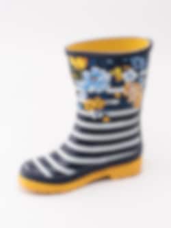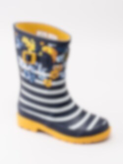 Gummistövel Jnr Welly Print från Joules tillverkad i mörkblå naturgummi med vita ränder och blommor. Dekorativ rem med gult spänne på utsidan. Präglad logga på framsidan av skaftet. Förstärkt kant längs skaftet och sulan. Gult foder och löstagbar innersula i textil. Gul yttersula i gummi med grovt mönster och logga.