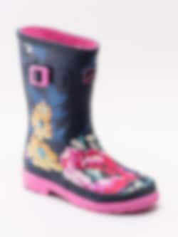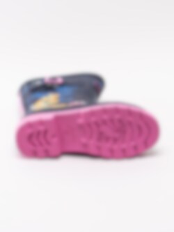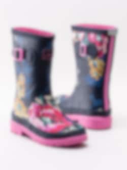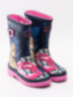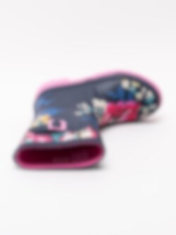 Mörkblå gummistövlar Junior Welly Print från Joules tillverkade i naturgummi som är slitstarkt och har god elasticitet. Piffa upp det tråkiga vädret med ett par blommiga stövlar från Joules med rosa detaljer. Rosa spänne på utsidan som detalj. Fodret och den löstagbara innersulan är i textil vilket gör att stöveln passar främst för regn i något varmare temperaturer.