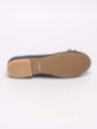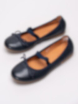 Mörkblå ballerinaskor från Froddo tillverkade i skinn. Tunn rosett vid framparti som detalj. Sydd rand i tyg längs öppning. Resårband över vrist för att hålla foten på plats. Brunt foder och innersula i skinn med präglad logga i häl. Låg klack på ca 1 cm. Beige yttersula i syntet med slät yta och präglad i silver.