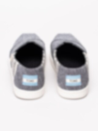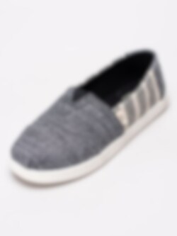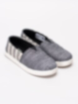 Mörkblå randiga slip ons tygskor Alpargata Seasonal New Youth från Toms tillverkade i textil. Sydd tygbit med logga på utsidan och på bakparti. Resår "v" för lätt på- och avtagning. Svart foder och innersula i textil med sömlös logga. Vit yttersula i syntet med mönster och präglad logga i mitten.