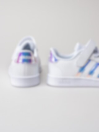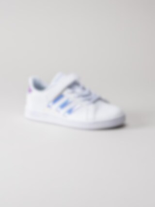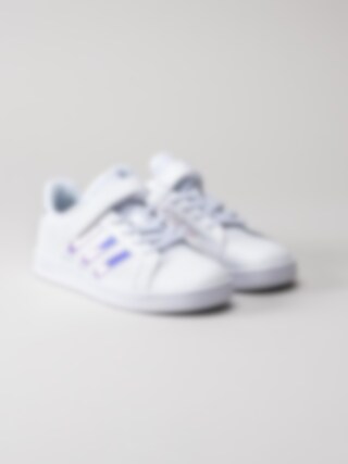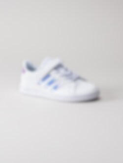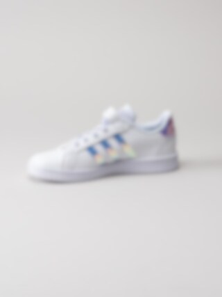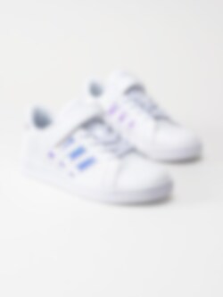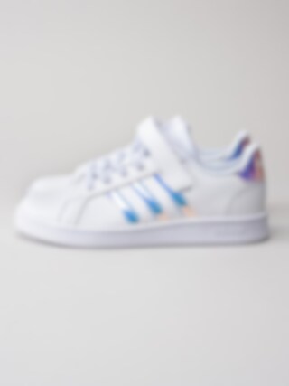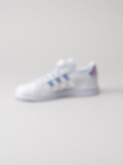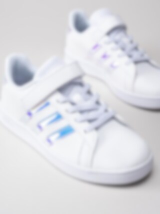 Vita sneakers med skimrande stripes Grand Court K från Adidas. Sportig och fräsch modell, ett måste till våren. Snygga reflekterande stripes i regnbågens färger på utsida och insida samt baktill.