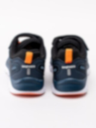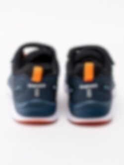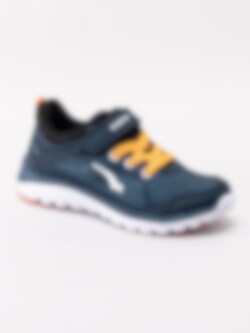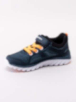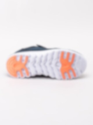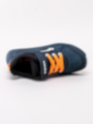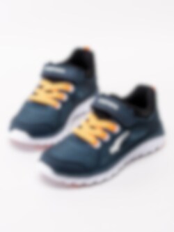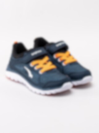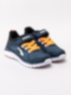 Mörkblå sportskor Dynamo från Bagheera i stickad mesh och partier i syntet. Sportiga fritidsskor perfekta till skolan och för lek. Sömlös logotyp på utsidan som detalj. Orange resårsnörning och kardborreknäppning för smidig påtagning. Textilfodrade med löstagbar innersula. Vit yttersula i syntet med orange partier.