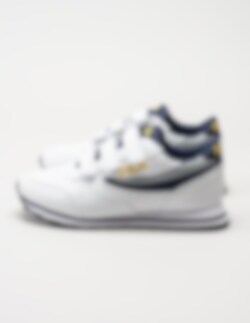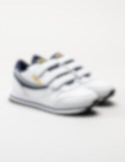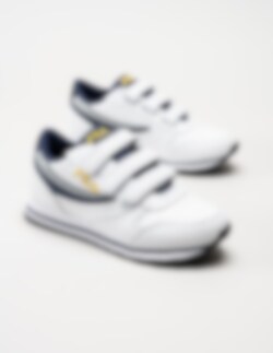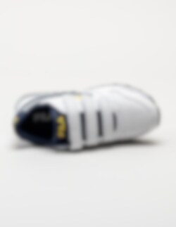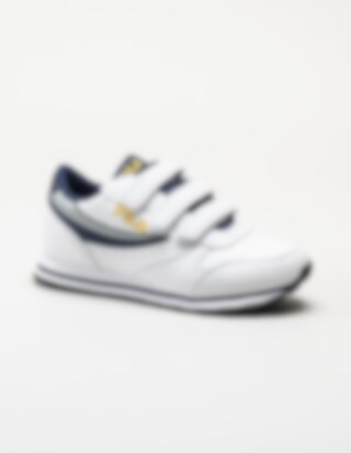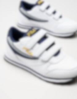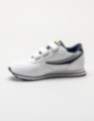 Vita sneakers Orbit Velcro Low Kids frå Fila. Snygga och bekväma retrosneakers med ovansida i syntet. Färgen är en vit med blå och gula partier som fina detaljer. Orbit Velcro Low Kids har foder och löstagbar innersula i textil, samt en yttersula i gummi. En mångsidig modell som passar för all lek!