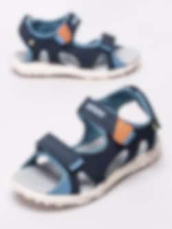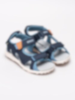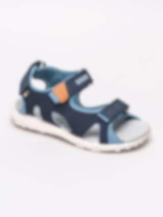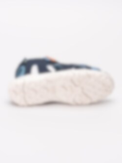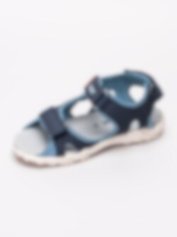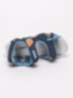 Mörkblå sandaler Rio från Kavat tillverkade i syntet med partier i textil. Broderad logga på kardborreband. Liten flagga på utsidan av bakparti. Justerbar tårem med kardborre för att anpassa passformen. Häl- och vristrem med kardborre som öppning. Ljusblått foder och ljusgrå innersula i textil med sömlös logga. Beige yttersula i gummi med mönster och konturerad logga i mitten.