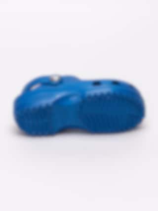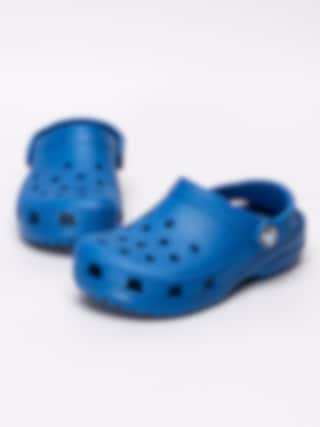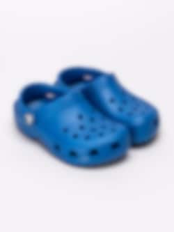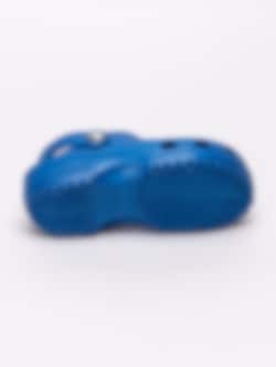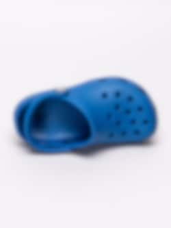 Blå badtofflor Classic Clog från Crocs tillverkade i mjukt Croslite material för ökad komfort och stötdämpning. Lufthål på ovandel och vid främre partiet. Rem som går att fälla upp och ned. Rund svart plastbit med vit logga som håller remmen på plats. Yttersula i syntet med randigt mönster.