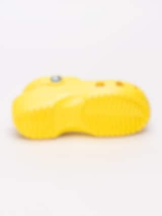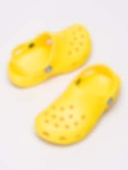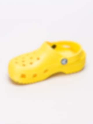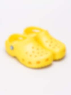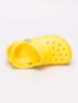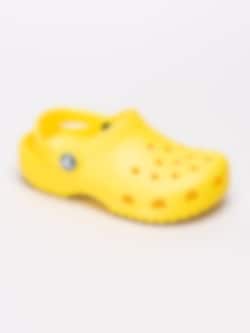 Gula badtofflor Classic Clog från Crocs tillverkade i mjukt Croslite material för ökad komfort och stötdämpning. Lufthål på ovandel och vid främre partiet. Rem som går att fälla upp och ned. Rund svart plastbit med vit logga som håller remmen på plats. Yttersula i syntet med randigt mönster.