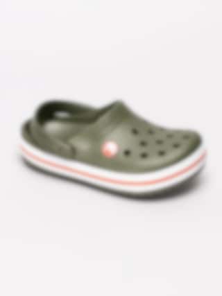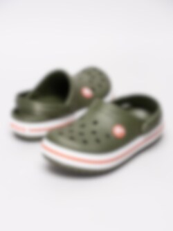 Mörkgröna badtofflor Crocband från Crocs tillverkade i mjukt Croslite material för ökad komfort och stötdämpning. Lufthål på ovandel med orange rund plastbit med vit logga på utsidan. Hälrem som går att fälla upp och ned. Rund mörkgrön plastbit med präglad logga som håller remmen på plats. Vit mellansula med ett orangt band runtom som detalj. Orange präglad logga på bakparti av sulkant. Mörkgrön yttersula i syntet med mönster och präglad logga.