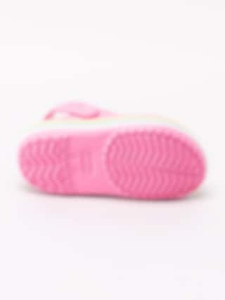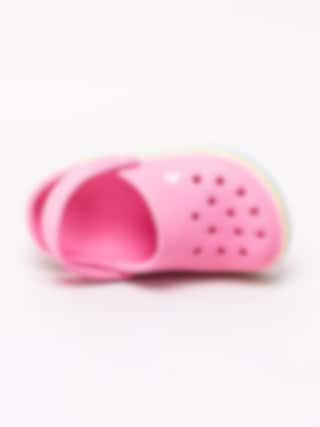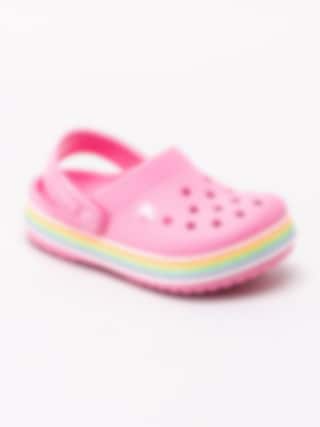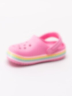 Rosa badtofflor Crocband Rainbow Glitter Clog från Crocs tillverkade i mjukt Croslite material för ökad komfort och stötdämpning. Lufthål på ovandel med rosa rund plastbit med vit logga på utsidan. Hälrem som går att fälla upp och ned. Rund rosa plastbit med konturerad logga som håller remmen på plats. Regnbågsfärgad mellansula som detalj. Rosa yttersula i syntet med mönster och präglad logga.