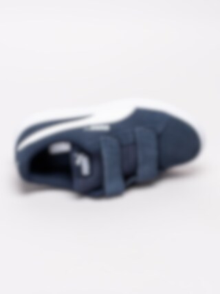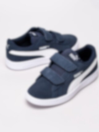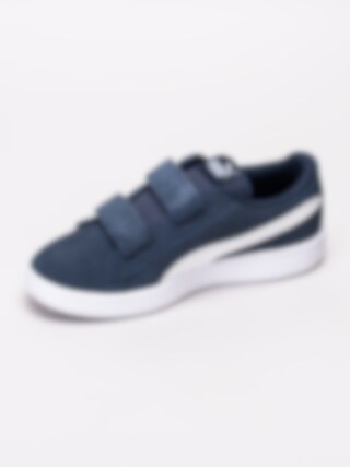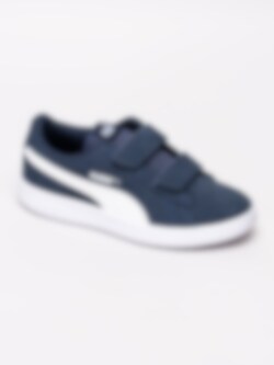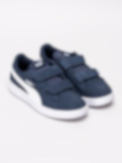 Mörkblå sneakers Smash v2 SD för barn från Puma tillverkade i mocka med plös i textil. Sydd vit PUMA formstrip på in- och utsidan som detalj. Sömlös logga på utsidan och på bakparti samt sydd tygbit med logga på plös. Två kardborreband som öppning samt för att anpassa passformen. Mörkblått foder och innersula i textil med sömlös logga. Vit yttersula i syntet med randigt mönster och präglad logga.