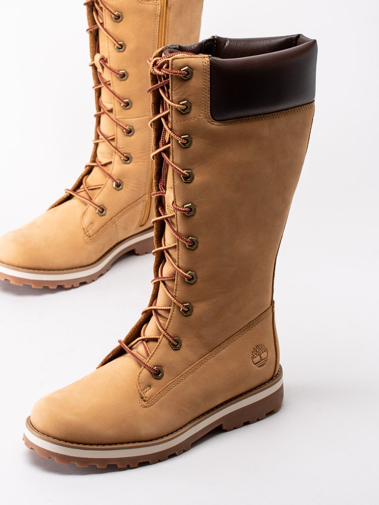 Svarta höga stövlar Courma Kid Girls Tall från Timberland. Jättefin Bikerinspirerad hög stövel i nubuck och lång snörning med snörhål i silver och där skosnörena är från 100% PET. Vadderad kant upptill på skaftet och plös i mjuk textil som är skönt mot benet. Dragkedja på insidan av skaftet för att snabbt och lätt komma i och ur stöveln. Skön uttagbar innersula i andningsbar OrthoLite®. Räfflad gummisula som ger bra grepp mot underlaget. Perfekt stövel till skolan för unga barn som vill se fina ut.